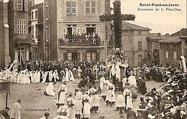 Cette fête était autrefois accompagnée en France de processions publiques où l'hostie était portée en grande pompe à travers les rues. Elles étaient entrecoupées de stations et de prières à des autels provisoires décorés, appelés reposoirs, disposés le long du parcours. À Angers, la procession qui s’appelait “sacre“ comportait de grands théâtres portatifs en bois du nom de “torches“ pour chaque corps de métier important6. Ailleurs, les hommes constituent une « garde nationale » où se mélangent sapeurs, tambour-majors et autres soldats en armes. Les costumes, fabriqués par les couturières du village, sont éclatants de couleurs. La troupe défile en musique (alternativement chants des hommes, chants des femmes puis la batterie fanfare) jusqu'à l'église dans un ordre imposé. Dans le diocèse de Metz, les premières communiantes de l'année précédaient le cortège en lançant des pétales de fleurs.