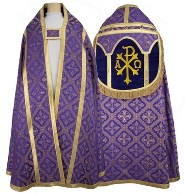 Grande cape de cérémonie, appelée par les rubriques « pluvial », de forme semi-circulaire, de la couleur liturgique du jour, agrafée par-devant et portée par le prêtre et l'évêque, principalement lors des bénédictions solennelles, aux vêpres et aux laudes solennelles et lors des processions. Jusqu'à la promulgation du missel romain de 1969, elle était également portée pour l'aspersion de l'eau bénite avant la Grand'Messe du dimanche.