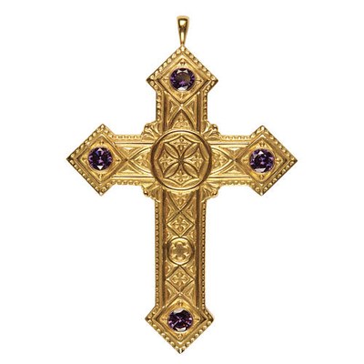 La croix pectorale est une croix de métal précieux, suspendue par une chaîne en habit de ville et un cordon de tissu à la messe et au chœur.