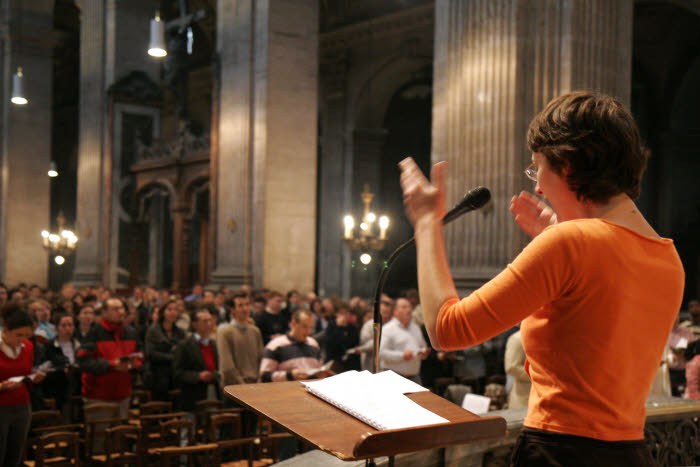 Animation des chants par une laïque pendant la messe de Pentecôte, organisée par les "Jeunes Professionnels Chrétiens" à Saint Sulpice, Paris (75), France.