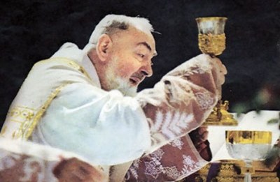 " Par une grâce particulière, tu as donné au prêtre saint Pio de participer à la croix de ton Fils, et, dans son ministère, tu as renouvelé les merveilles de ta miséricorde ; par son intercession, nous te prions : à nous qui sommes associés aux souffrances du Christ, ccorde la joie de parvenir à la gloire de sa résurrection" (extrait la prière d'ouverture)