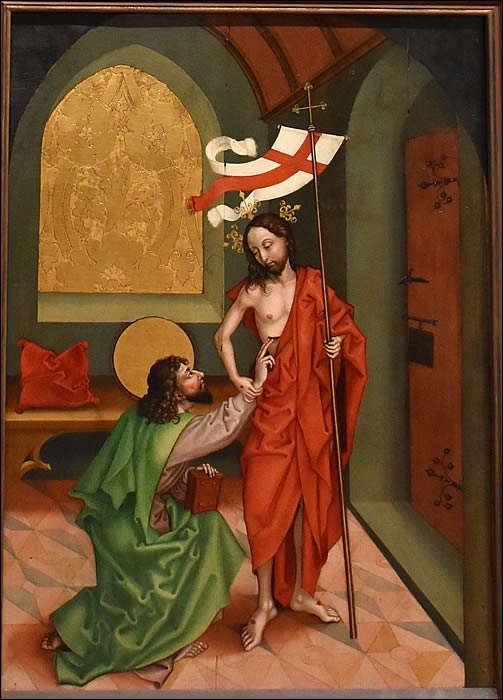Thomas, l’un des douze (dont le nom signifie Jumeau) n’était pas avec eux quand Jésus était venu. Ce disciple était le seul absent. À son retour, quand on lui raconta ce qui s’était passé, il ne voulut pas le croire. Le Seigneur vint une seconde fois, et il présenta au disciple incrédule son côté à toucher, lui montra ses mains et, en lui montrant les cicatrices de ses blessures, guérit en lui la blessure de l’incrédulité. Que remarquez-vous en tout cela, frères très chers ? Croyez-vous que tout cela se soit produit par hasard ? Que ce disciple choisi ait été d’abord absent ; qu’en arrivant ensuite il entende ce récit ; qu’en l’entendant, il doute ; qu’en doutant, il touche, et qu’en touchant il croie ?