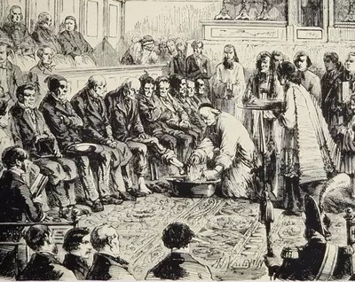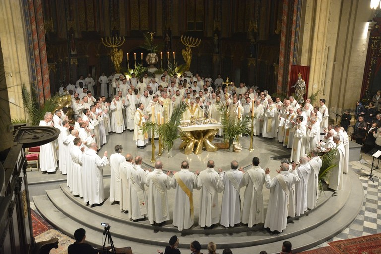 Le jeudi saint aborde le grand passage de la Pâque par l’institution de l’eucharistie opérée par notre Seigneur Jésus Christ, la veille de sa passion. La célébration de l'institution de l'eucharistie est marquée par le geste du lavement des pieds.
