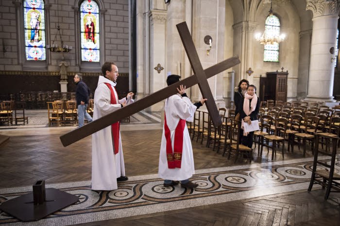 Chemin de croix. Prêtre sortant la croix de l'église Saint-Ambroise, lors du Vendredi Saint. Paris