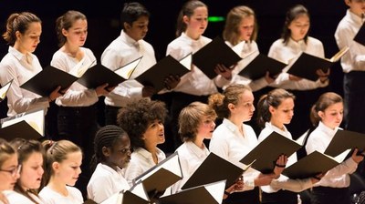 Oeuvre pour douze voix mixtes, grand chœur mixte, voix d'enfants et ensemble instrumental.