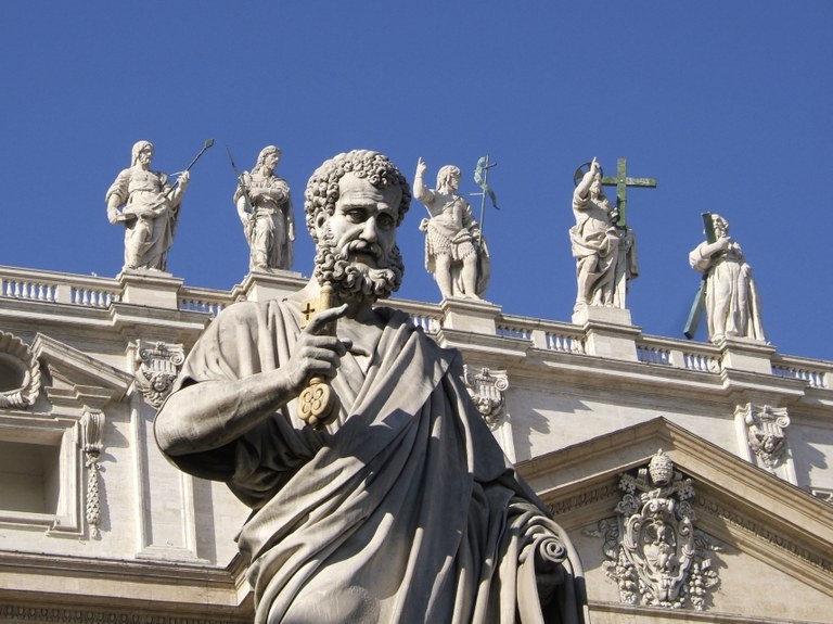 Tu es Pierre, et sur cette pierre je bâtirai mon Église, et les portes de l’enfer ne tiendront pas contre elle. Je te donnerai les clés du Royaume des Cieux : quoi que tu lies sur la terre, ce sera tenu dans les cieux pour lié, et quoi que tu délies sur la terre, ce sera tenu dans les cieux pour délié.