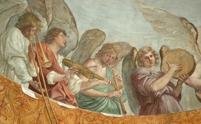 Le second point est coram angelis : en présence des anges. Benoît voulait certainement dire aux moines qu'ils devaient réfléchir au fait que les anges sont silencieusement présents au choeur, qu'ils entendent et que le chant doit être tel qu'ils puissent l'écouter. mais nous aussi chantons avec eux. Nous devrions du coup afin d'ouvrir « l'oreille du coeur » comprendre, pour ainsi dire de l'intérieur, le chant des anges, nous y accorder et chanter avec eux. Ce chanter ensemble inclut ensuite naturellement la communauté entière des saints de toute époque et de tout lieu.